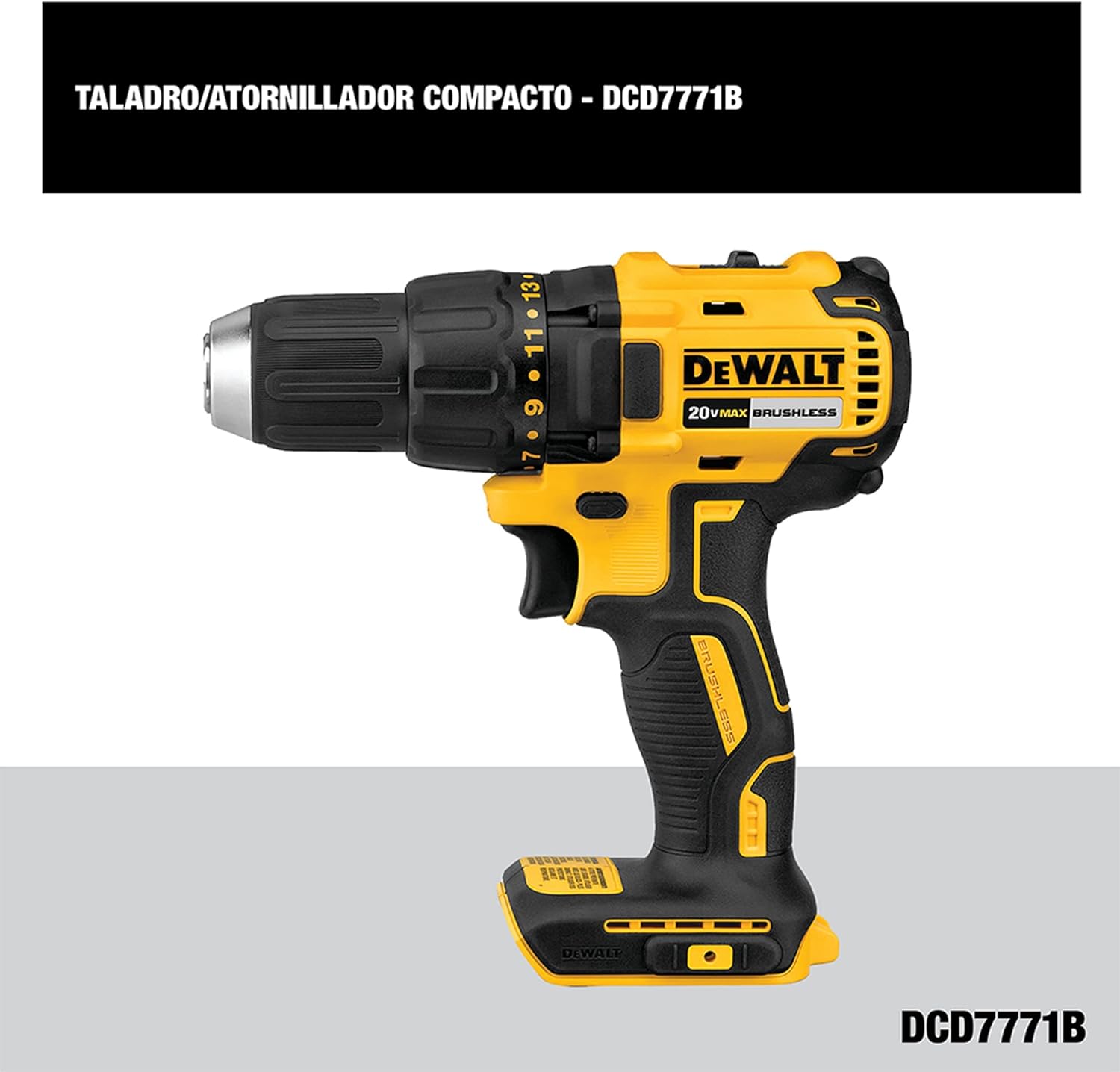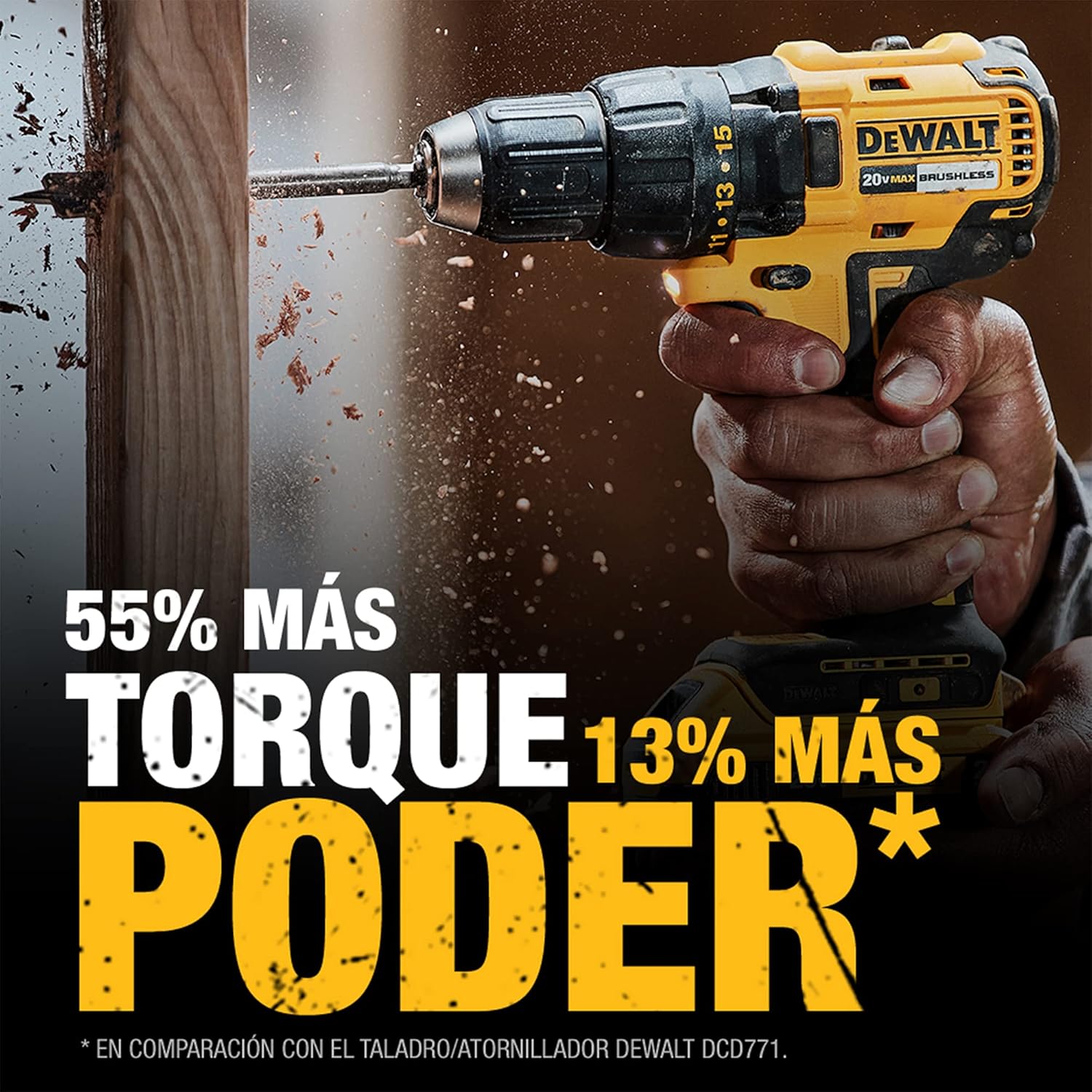 • 55% Más torque, 13% más potencia en comparación con el Taladro Atornillador DEWALT DCD771.